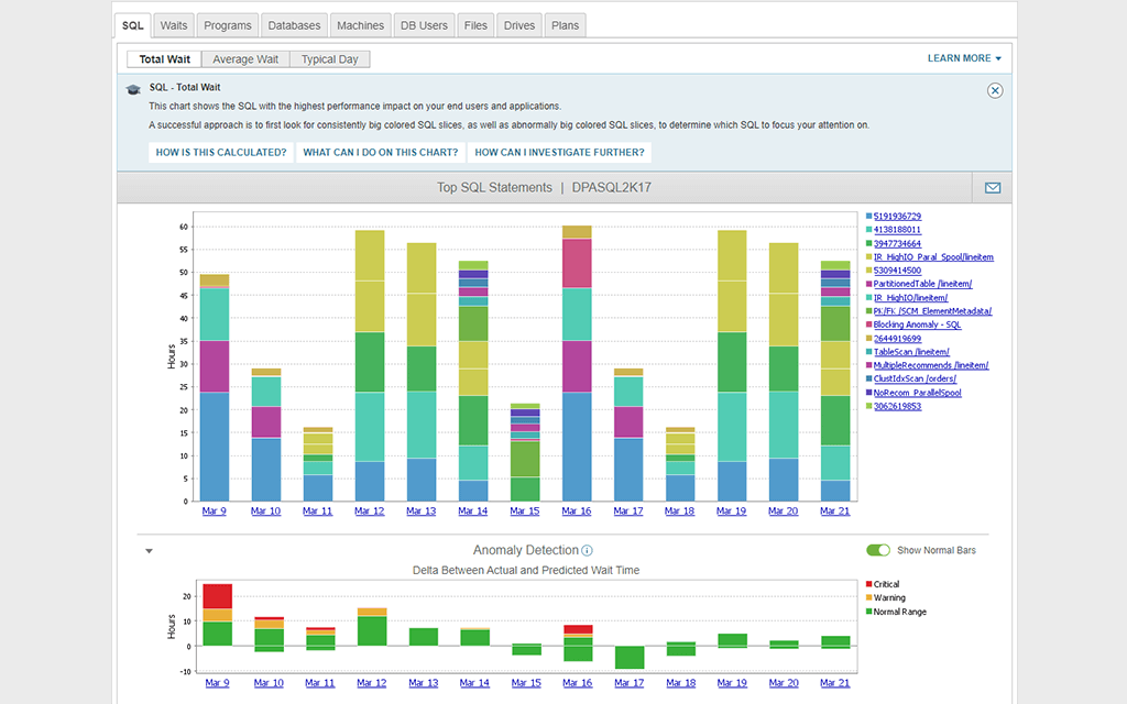 SolarWinds Database Performance Analyzer is built to use wait-based analysis to identify which issues and performance slowdowns can yield the greatest improvements in overall server and database performance once resolved or optimized.