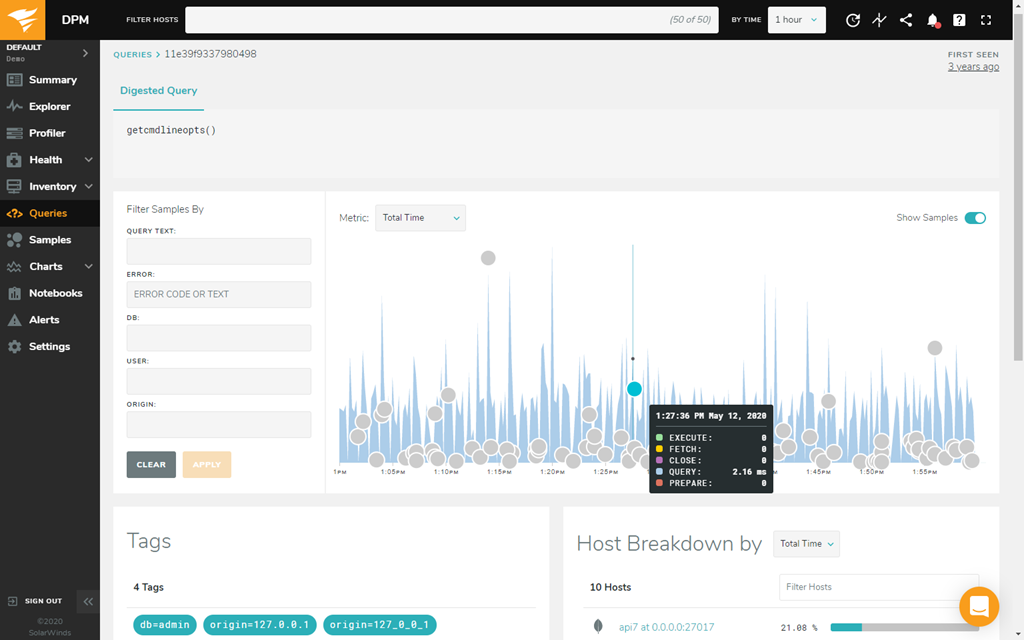 Before releasing code to production, your entire team—developers, QA, DBAs, and DevOps can use SolarWinds® Database Performance Monitor (DPM) to visualize the impact and runtime of upcoming changes. You can use visual performance analysis, deep SQL parsing and heuristics, and execution plan analytics to spot events/trends.