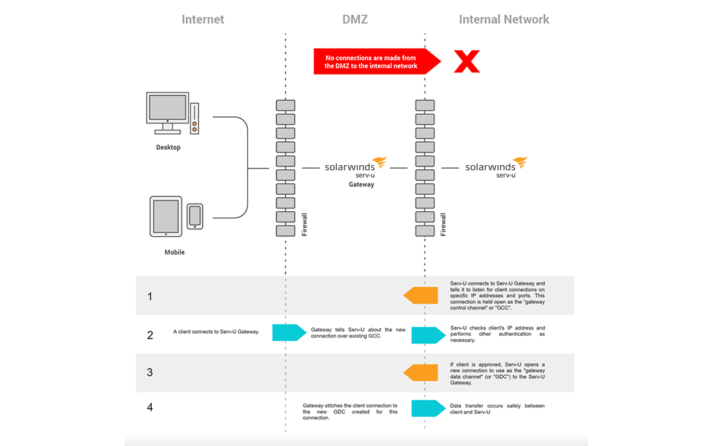 Proper data security and compliance depends on a solid technical foundation. The optional Serv-U® Gateway add-on can provide defense-in-depth security to Serv-U FTP Server deployment by ensuring no data is stored in the DMZ, which can help you comply with PCI DSS, HIPAA, FISMA, GDPR, and other high-security compliance standards and data protection regulations.