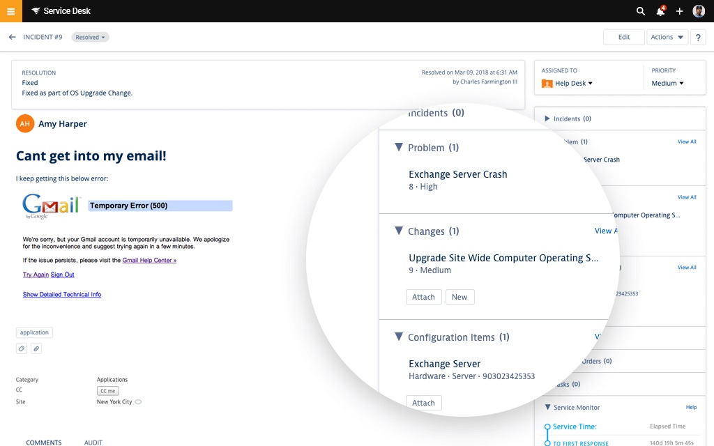 Since ITIL is a framework, the adoption of ITIL best practices vary from one organization to another. We help you adopt and support ITIL best practices by giving you the power to assess your employees’ needs. For both requesters and agents, incidents and impacted assets are matched with relevant solutions articles. And once your IT team has received a ticket, they can quickly fulfill employee needs by visualizing the full incident lifecycle while keeping ITIL best practices in mind by easily escalating incidents to a problem or associating them to an upcoming change.