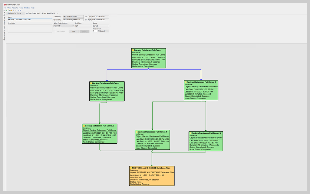 Event Chains in the SQL Sentry Event Calendar helps you create workflows containing SQL Server agent jobs or Windows scheduled tasks from any server you’re currently monitoring. Each event chain is a series of dependencies between events running on the same server or different servers.