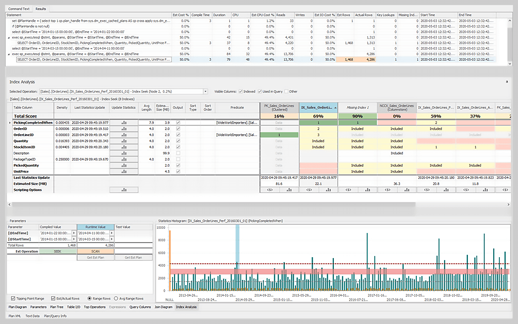 Index Analysis in Plan Explorer guides you based on tried-and-true indexing methods to create the best index to cover a query. And when you run the query after applying the index, you’ll get an overall score for your index based on the SQL Sentry index scoring algorithm.
