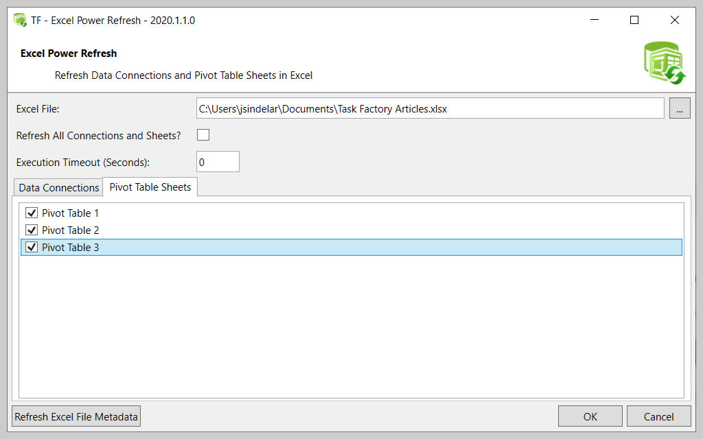 The Excel Power BI Refresh Task is a control flow component that refreshes an Excel file with Power Query connections and Power Pivot tables. It's especially useful if you want to regularly refresh Excel files on a shared drive without having to purchase SharePoint.
